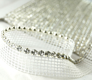 Length: 10 metres on the card Diamonte Size: 3mm Colours: Clear, Blue, Pink, Purple White Mesh/ Net Width: Approx 5mm